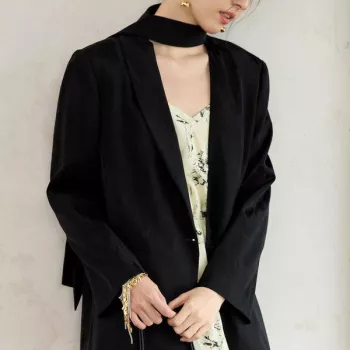 Elegant Black Blazer Coat with Neckline Ribbon Design for Office Ladies