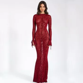 Long Sleeve Deep V-Neck Crystal Padded Velvet Party Dress