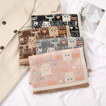 Women’s Winter Long Pashmina Shawl Scarf – Cartoon Cat Pattern Double-Sided Muffler